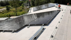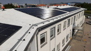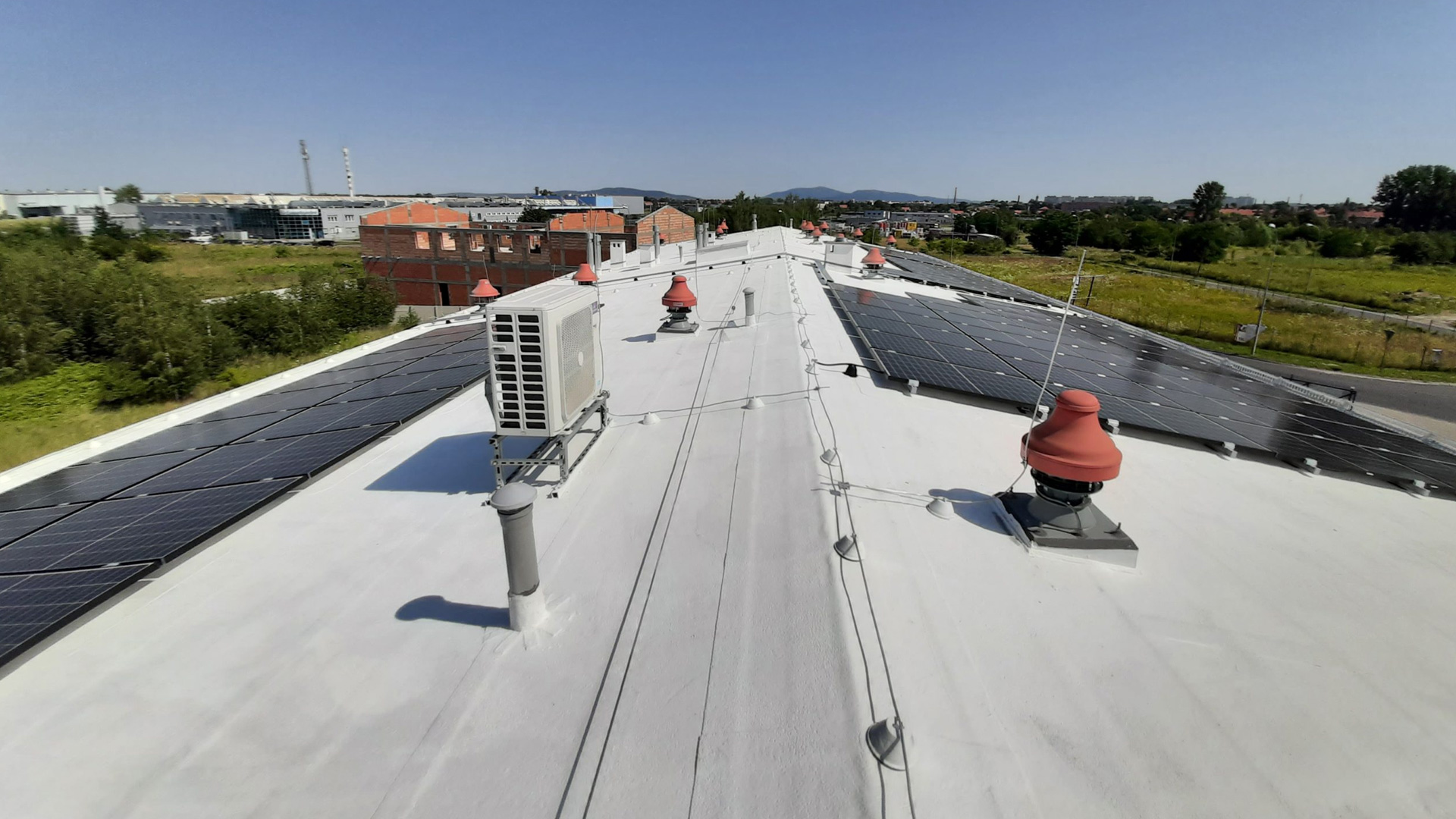 Implementation of a Complete Energy Roof, including the installation of safety measures, application of COOL-R coating, and a 50 kWp photovoltaic system using ballast-free technology with enhanced fire safety measures. By using CWL thermally welded tiles, the installation was possible without adding extra load to the building or disturbing the existing roofing.